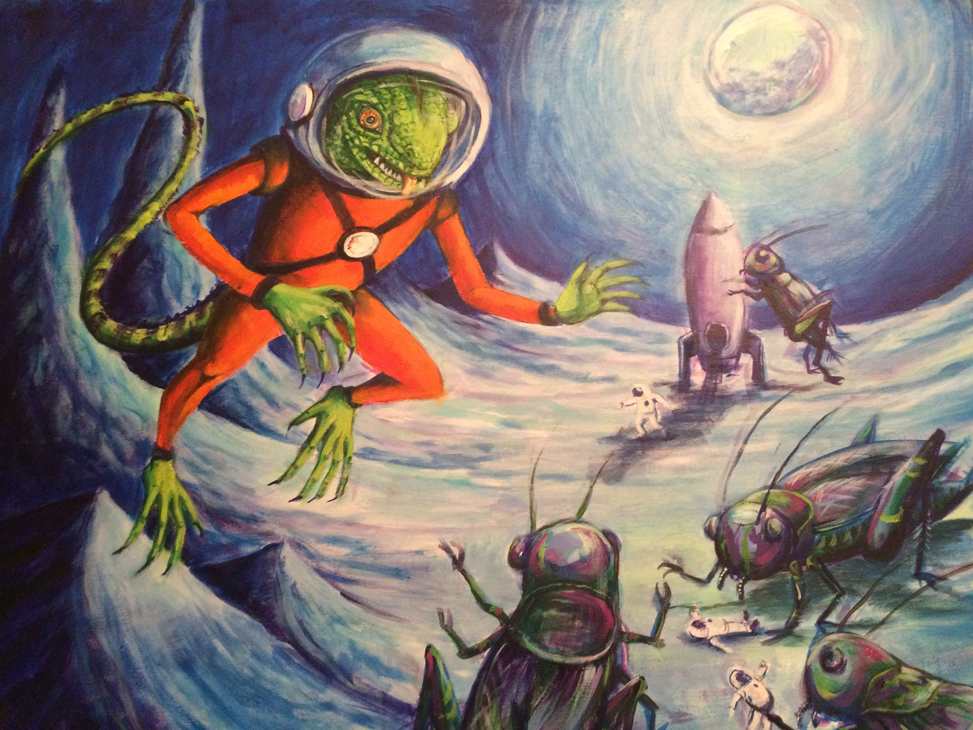 The silence of the lunar surface is disturbed by the confused chirping of mutant crickets, the screams of the intrepid astronauts, and the deadly leap of the Astro Lizard.